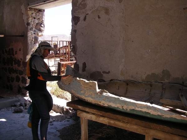 Doug Hamilton examining an old boat in the ghost town on Isla Carmen
