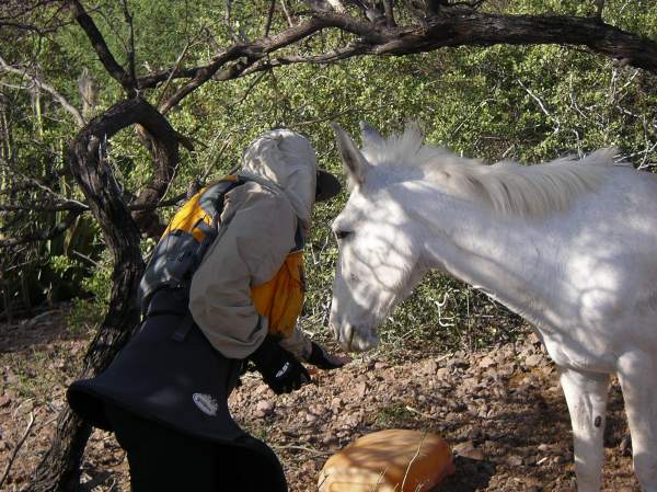Andrea Wolf gets to pet a mule near Punta La Aguilillo