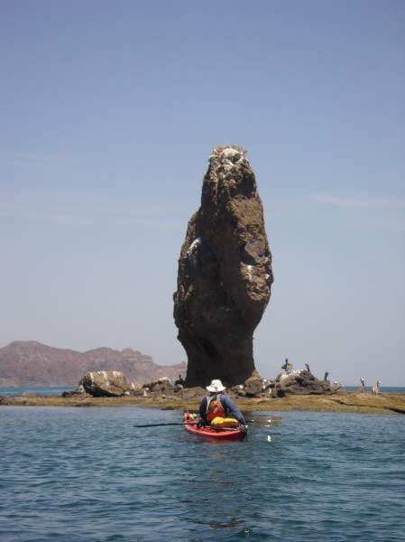 Don Fleming got out of his boat to pretend to push over the spire of rock at Islote Blanco