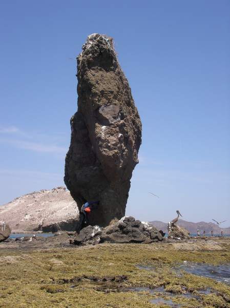 Don Fleming got out of his boat to pretend to push over the spire of rock at Islote Blanco