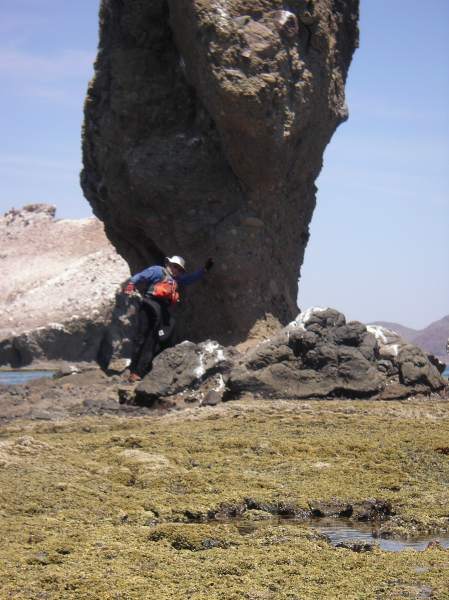Don Fleming got out of his boat to pretend to push over the spire of rock at Islote Blanco
