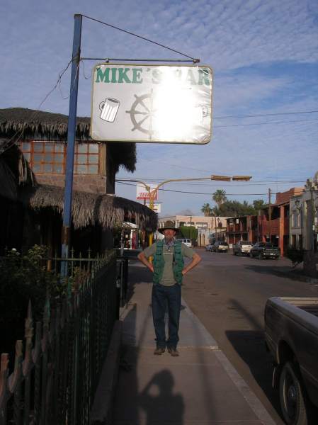 The intrepid kayaker standing in front of Mike's Bar