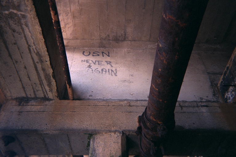 Grafiti on Mare Island pier: "USN Never Again"
