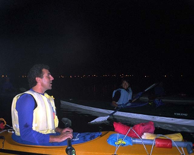 Paul starting out for a moonlit paddle around the Marin Islands.