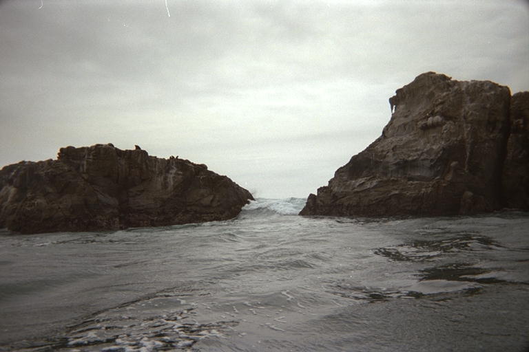Wave breaking between two sea-lion-covered rocks.