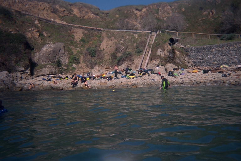 Gerstle Cove covered with divers like neoprene seals on a rock.