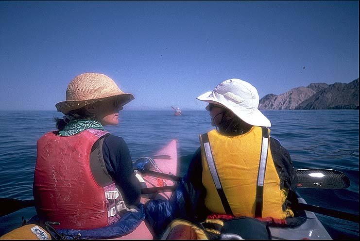 Jean Severinghous and Mari Brandt aproaching the rocky end of Punta Final.