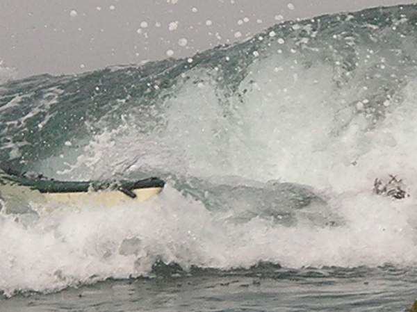 Nose of a kayakk coming out of the toilet bowl at No Name
