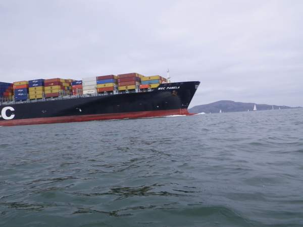 I got yelled at by the harbor pilot for crossing too close in front of this ship