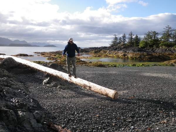 Don Barch teeters on the balancing log at our Cuttle Island campground