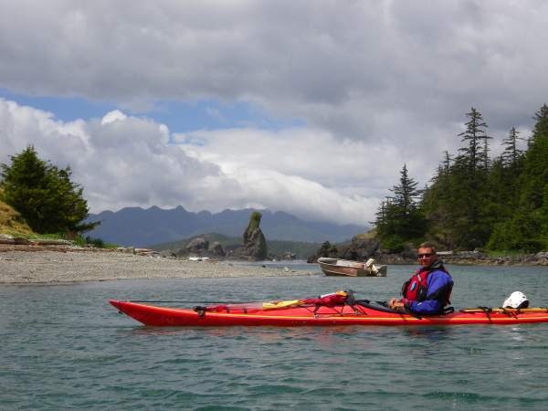 Doug Hamilton in front of Lucys beach, with the guardian rocks in the middle ground