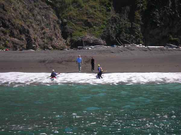 Dave Littlejohn and Dörte Mann launch from Lost Beach with Fred Cooper and Maryann Furda assisting