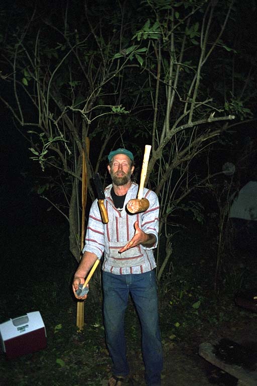 Don 'ductape' Barch juggles knives and abalone pounders.