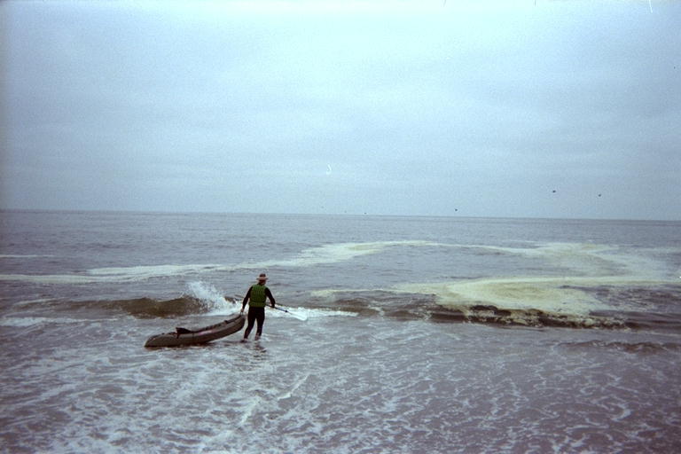 The intrepid kayaker draging his kayak into the water at Point Reyes Beach South