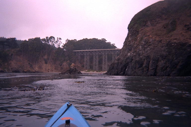 A steel trestle bridge under Highway One on the Mendocino coast