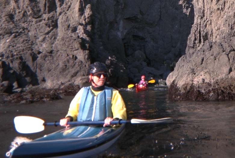 Roger Lamb and Don Flemming exiting a cave at Jenner Beach