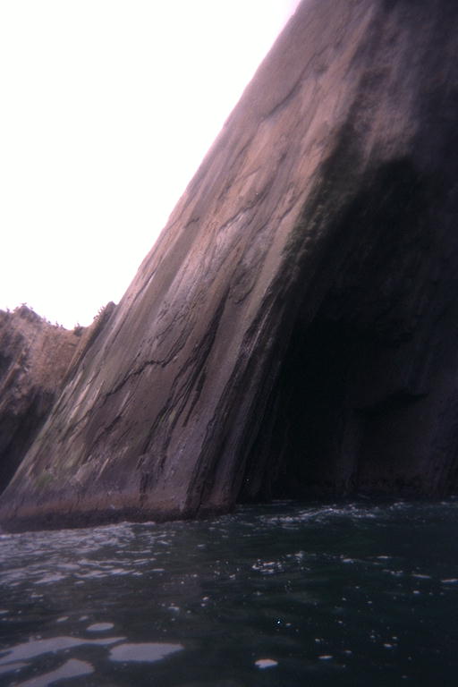 The island is made of rock layers tilted over 60 degrees.