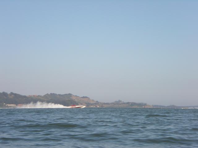 A jet boat zooms around San Francisco Bay
