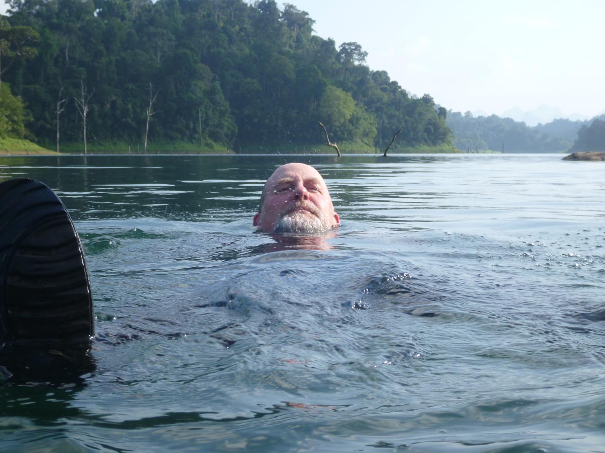 The intrepid kayaker swimming in the Khao Sok lake, Thailand