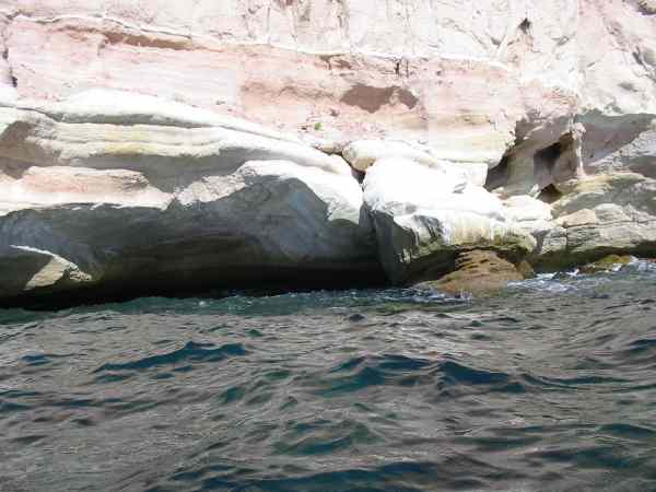 Steep rocky shoreline of the west side of Isla Tiburon