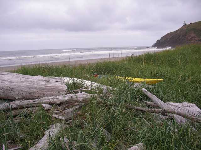 The kayaks hidden in the saw grass all night at Fort Canby State Park