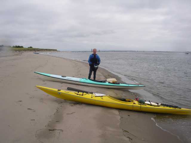 Roger Lamb after paddling all of Washington, on Sand Island in Oregon