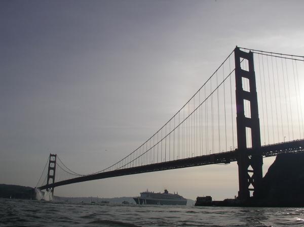 The Queen Mary 2 passes under the Golden Gate Bridge