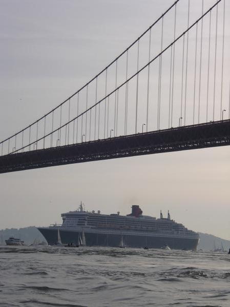 The Queen Mary 2 passes under the Golden Gate Bridge