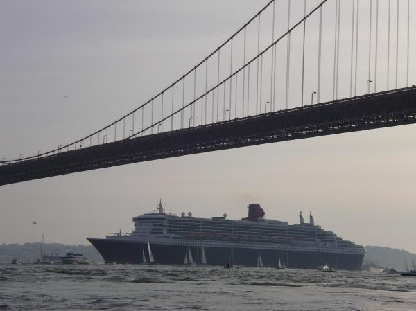 The Queen Mary 2 passes under the Golden Gate Bridge