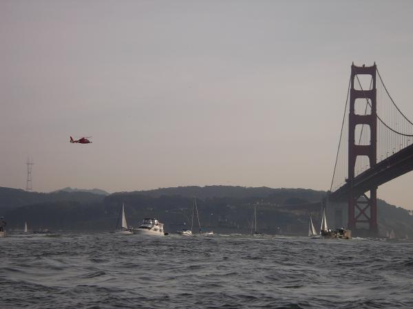 A Coast Guard Helicoptor approaches the Golden Gate Bridge