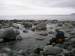 A river flows through the boulders of the beach