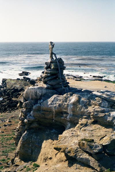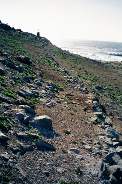 We went for a walk to the ends of the island. Everywhere we went we sank into holes in the sandy soil. We found out later that these are dug by a burrowing bird that spends all day out at sea and comes back to remote islands to sleep underground at night. A statue that I had seen while approaching the island turned out to be a pile of rocks and driftwood. A stone lined trail, the only one of it’s kind on the island, runs from the “statue” to small cave. Farther around the island we stopped at the lighthouse, a solar powered light that stores up sunlight by day and spends it flashing at night.