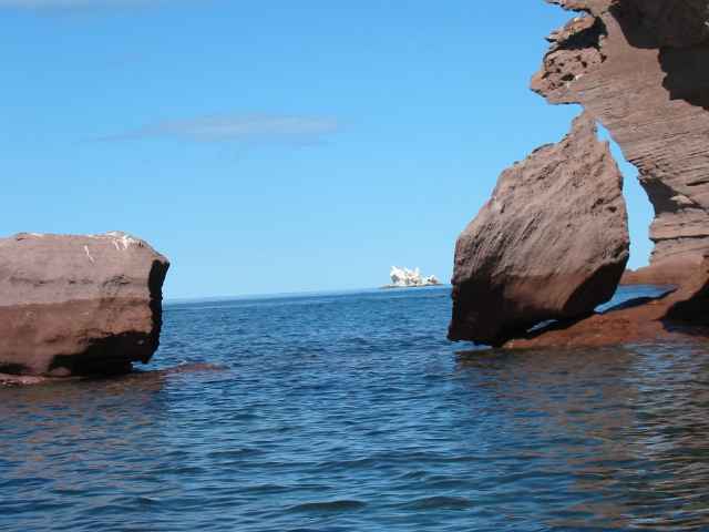 We stopped to photograph our first cave on the island. Before this point the shore had been gravely, from here on it was rocky and varied, with small caves and coves to poke into. There is a white spire of rock offshore, Roca Vela, and many rocks close to shore. One of these had an arch in it. Just large enough to fit my kayak through. Next we rounded the end of the west shore and turned into the channel between the main island and Isla Mejia. A current slowed us down but swell rose up a little and helped us forward. A peninsula that was supposed to add 2 kilometers to our day helped us with a shortcut across a spit that was under water at high tide.