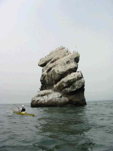 The sunny day developed thick fog and overcast and we did not see Morro Rock until we were less than a mile away from it. Actually when we did get close enough all we could see was the bottom of the rock, the rest disappeared into the mist. We paddled around the rock, going behind a smaller offshore rock. We turned into the breakwater and started checking out the shore for places to camp.