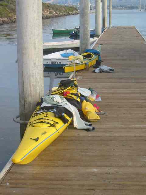 Konstantin’s wife Linda was going to be at Hearst’s Castle on this day and was going to try to visit us on her way by. There was no good place to get out of the sun on the spit where we planned to camp, which is a State Park and probably off limits to campers So we decided to land at a public dock across the bay in the city of Morro Bay. We changed into street clothes and hung around until 7:00 PM waiting to see in Linda would show up, but she never did. The city park did have water for us to re-fill our water bags, but in retrospect it was not a very nice way to spend the afternoon. We had to practically unpack our boats on the dock to get just some of our stuff out. The city park did not have anyplace to get out of the sun, so we might as well have been camped on the dunes. Sitting around in a tourist town was not our kind of camping trip.