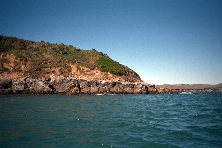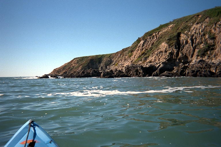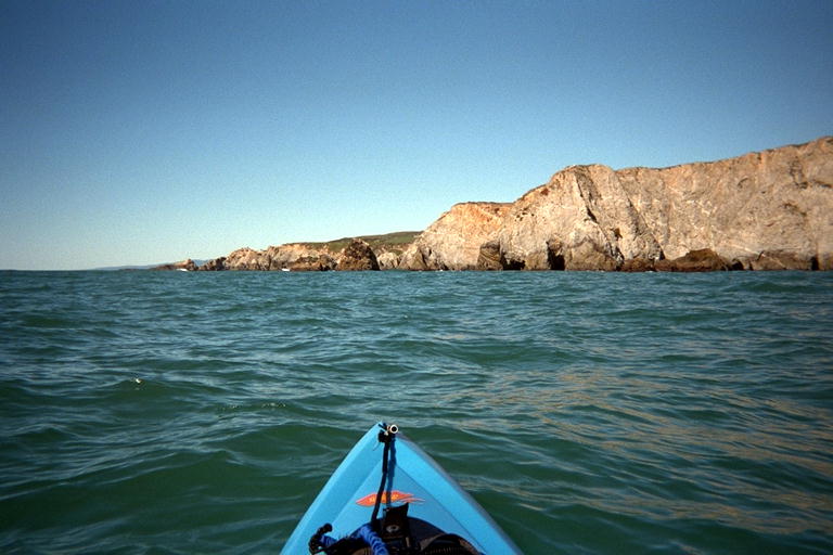 The tide was high but not going out yet. We paddled a short distance down to the base of the jetty, and discovered that there was a little notch in the breakwater. We were able to drag the kayaks through this and save over a kilometer paddling out to the end of the jetty and back. From here we paddled south and west along the edge of Bodega Head. The NOAA buoy was reporting 5 foot swells, and this part of the Head should have been well protected. But as we went farther and farther south some pretty large waves refracted around the head and broke into the rocks. I had hoped to take Jeremy behind all the rocks in the water here, but we had to avoid them. It is one thing to look at a wave and wonder if it is going to get me in trouble. It is entirely another type of chilling fear to look at a wave and wonder if I am leading someone else into trouble. So we got farther and farther from shore as we got out from behind the protection of the Head.