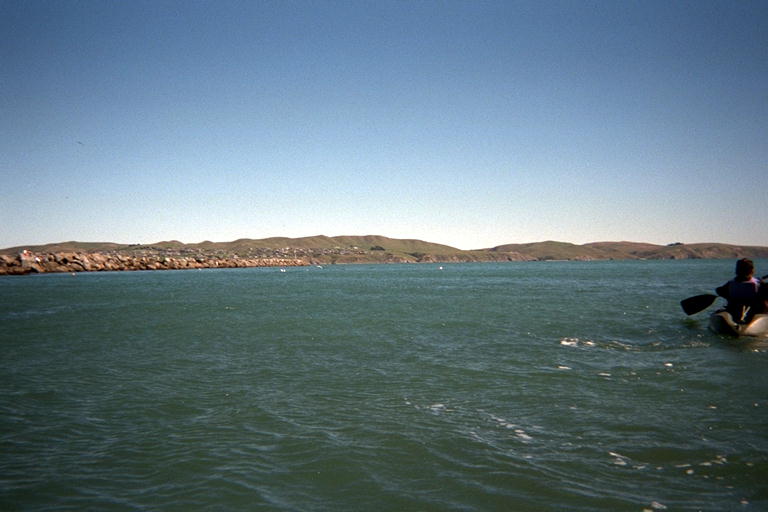Once we were back in the water, I took us diagonally out to the end of the jetty. I thought it would be interesting to paddle down the length of the channel and go back a different route. But when we got out to the tip, the wind came up again and the tidal current was zipping out and around the end. In my original plan of going all the way to Mussel Point and back I had assumed the tide would be slack or even flooding back in when I returned. But this short aborted trip stuck us in a strong ebb current. Jeremy fought his way around the point and into the channel, muttering that he couldn't keep this up all the way to the beach. Then he scowled at me when I told him to "waste all that effort" (his words) and go back around the end of the jetty so we could go up the south side of the breakwater.