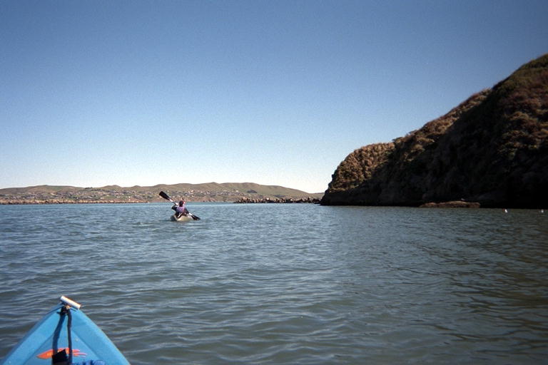 The water started to get choppy and Jeremy's arms started getting tired. I tried to talk to him about efficient paddling techniques but he was no longer having fun and not in the mood for listening. I talked him into following me far enough to see around the southern tip of the Head. We could see a large group of people on the top of the cliff watching for gray whales going by on their migration. We didn't see any sign of whales. And from our farthest reach we could not see Mussel Point. When we turned back, I discovered that the north-west wind we were promised was coming directly from the north. We had to work hard to paddle into it, and Jeremy started having even less fun. I took pity on him and let him hook his bowline to the stern of my kayak and towed him part of the way back. He paddled along with me to carry part of his load, and complained that just putting the paddle in the water to keep up with me was wearing him out!