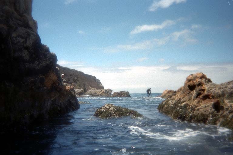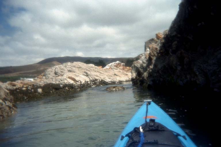 When I turned back into the cove I felt a little more confident and paddled into the rocky reef. Here I found two guys who had paddled out here on their surfboards in wetsuits. They were "poke pole fishing" in cracks under the rocks in the reef for fish and said that the fishing was good. I found a channel behind the reef here that was almost deep enough to paddle in. By waiting for large waves to send pulses of water through, I was able to follow the channel anyway and came out near the short inaccessible section of beach on the south end of the cove. I paddled to the other end of the cove and rode into one of the narrow channels that I had avoided earlier. Then it was time to pack up for the long ride home.