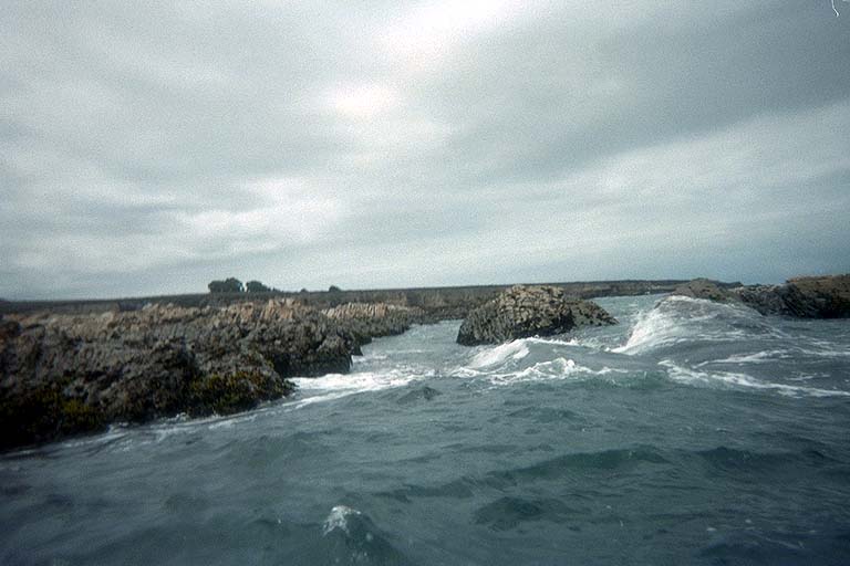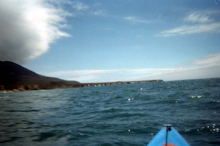 After lunch I explored the south side of the cove. There is a dike of rock sticking out into the cove that has a cluster of rocks just offshore. I paddled between these rocks on the way out and got knocked out of my boat by a large wave. My sister tried to climb around the point to get to the little beach behind this point but found the going a little rough and turned back. Sopping wet from tumbling in the water I was a little more conservative and stayed out of the rocky reef past this beach. I paddled out to the point and almost a kilometer farther south. Once I got out from the protection of the point I came into the full force of the southern swell from the hurricane. All the shore south of the point was too rough to consider landing, although I was tempted a few times during mild sets of waves.