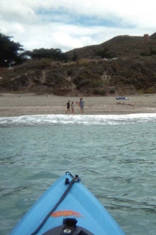 While driving down the Central Coast looking for put-in spots on Friday with Joan and Robbert, I had looked at the beaches in this state park. There is a large cove here that faces north so it was protected from the southern swell from the hurricane down near Mexico. This cove has two narrow channels on the north end, and another small cove on the south side. The extreme sides of the cove are made of low stony reefs that looked interesting to explore on a mild day. I spent Saturday evening visiting with my sister Margie who lives in the area and suggested that she take her kids down to this beach with me on Sunday. Joan and Robbert had given up on the waves and went home Sunday, so I would be paddling alone.