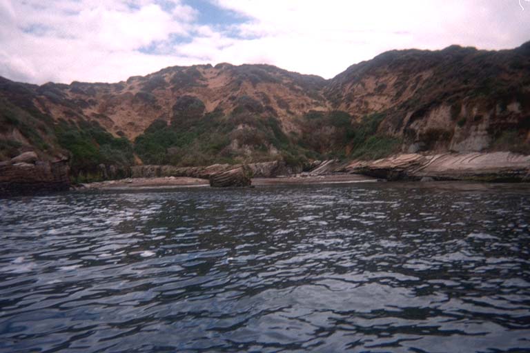 I arrived before my sister and launched to explore the north side of the cove. I was unwilling to risk the narrow channels on the north side of the beach and headed north around the stony reef. This section of shore was still reasonably well protected from the southern swell. I was able to go behind the stony reef in a few places where there were channels of deeper water. One of these channels was wide enough and deep enough to go all the way into the cliffs were there was a small sandy beach. I paddled into this channel and caught a wave to surf me onto the sandy beach. The water in the channel was shallow and had a rocky bottom, conditions I have found good for kayak surfing before. I paddled back and forth here and got some pretty good rides. Then I paddled back to the cove to have lunch with my sister and her kids.