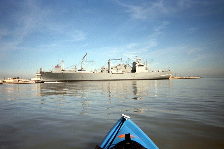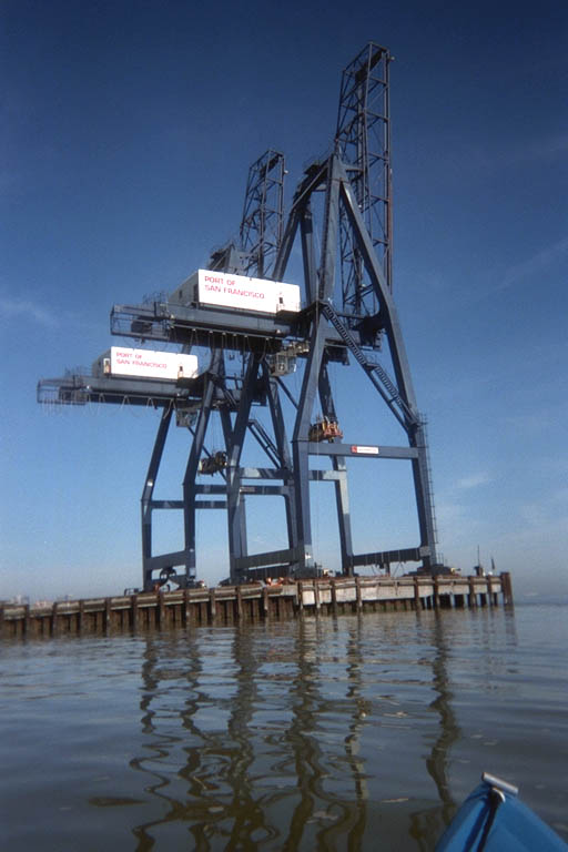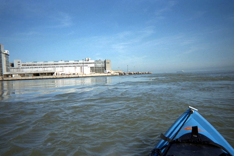 The Navy wasn't building any new ships here, but there was still a huge crane and several large boats that had cranes all over them. As I was paddling behind one of these boats, the water started to act wierd around me. Several long slow swells picked me up. These could not have been wakes because I had not seen any boats go by. The water started to swirl around me and stir mud up off the bottom. Water rose up in some places like an upwelling and visibly slipped back down and sideways, pushing my kayak with it. Not knowing what was going on, I felt a little chill of fear. I started flailing around in my head for a hypothesis to explain all this. Was there a creek or a storm drain between the Navy piers that emptied here? But San Francisco doesn't have any creeks with enough volume to explain all this and it hadn't rained recently enough for storm runoff. Perhaps the Navy has a submarine here that was about to break the surface next to me. The hatch would open and an officer with a machine gun would arrest me for violating the 200 yard distance from their docks. But that was ridiculous: submarines don't run beneath the surface when they don't have to and certainly not in the shipyard. And a submarine is just a little bit of overkill for enforcing a no-float zone.