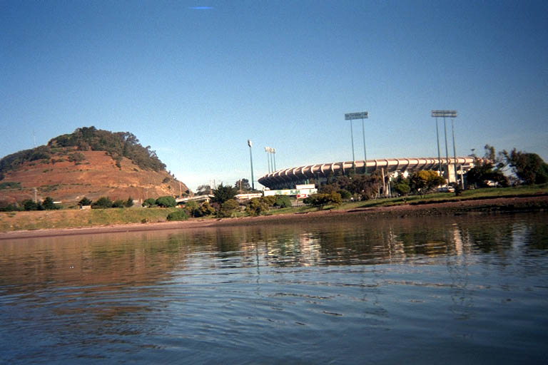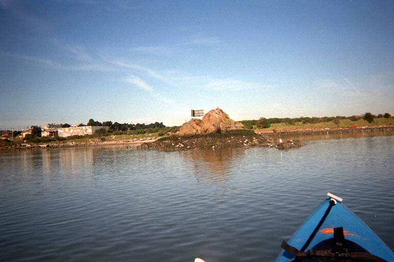 The tide was out and I had to cross a stretch of sharp-cornered crushed rock to get to the water. Almost all the shore in this area is landfill, and the weather hasn't had time to grind the rocks smooth yet. The water was calm and flat across The Bay, and I paddled under a few fishing piers that were part of the park. Around behind the first point was a little artificial harbor with an imported sand beach. I didn't find this interesting and turned away without bothering to hug the shoreline. Around the next (90 degree) corner there was evidence of a lot of recent construction: Two barges in the water, one with a big backhoe parked on it. A tugboat tied up to the two barges. Surrounding the equipment was the start of a forest of new concrete piers. Leading into the water from the park was a newly-bulldozed ramp in the landfill. What is going on here? It looks like someone is building an immense new pier or putting in the foundation for a building on the water. Why is the city allowing more of The Bay to be covered up? Why is it attached to the State Park? If the State Park Department has millions of dollars to "develop" the waterfront of this park, why do they claim to not have the funds to repair the broken wooden stairs at Fisk Mill Park? Behind this construction I found two attractive natural rocks sticking out of the water. Probably the only natural piece of shoreline I saw all morning. I wonder if the new construction will cover it up?