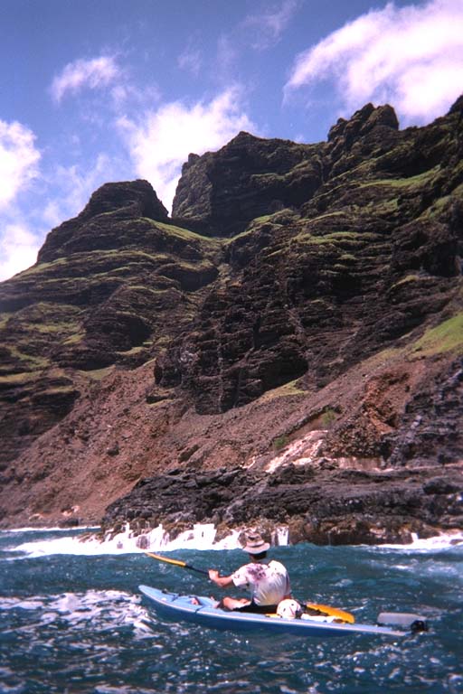 We paddled on toKawelikoa Point,our destination. Jamie was wearing my hat because he forgot his visor (and his PFD -- Shame!). He pulled way ahead of me and disappeared around the point. When I finally caught a glimpse of him again, he was wearing his helmet instead of the hat. Uh-oh! He must be planning something dangerous. Sure enough he was looking at a shallow cave, a big dent in the cliff. When I got there he driftedcloser and closeruntil he was under the overhang. Then I saw what he was really up to. What I though was just a bump in the cliff to my left was actually a big rock with a channel behind it. Jamie waited out a large set of waves in "the dent" and then paddled around and out the channel. I figured that the next large set was a ways off so I paddled directly in. I turned and followed him out the channel with no problems.