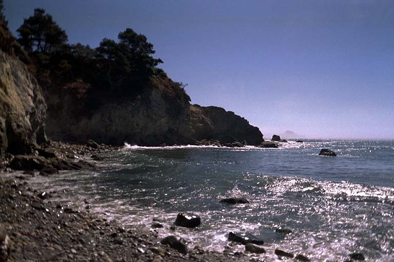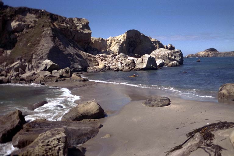 As we paddled north to the tip of Havens Neck the fog closed in, the wind came up, and the ocean got fairly choppy. Ken observed that these were pretty miserable conditions. We had both brought equipment to go abalone diving, but in these conditions we didn’t feel like trying it out. We turned in towards land, plotting a course by compass in the thick fog, and pulled out of the fog into a sunny day on a mild beach north of the Neck. We almost considered going abalone diving here, but it didn’t look like a place I would have expected to find them. We got back in our boats and continued north close to the shore.