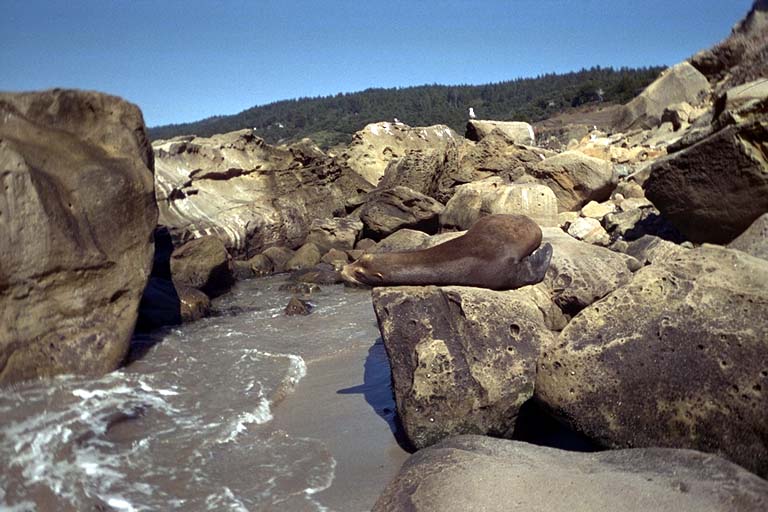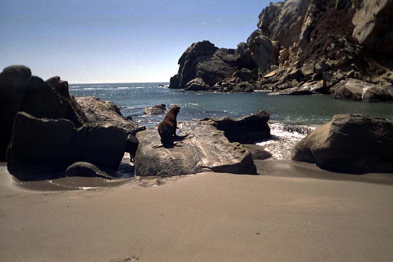 On the way back to Anchor Bay we went between the Fish Rock islands again. This time I decided to land on the little beach where Ken got stuck and try to sneak up on a sea lion to take it’s picture. I saw one and landed my boat behind a rock out of view. I hurriedly pulled my boat up closer to this rock and sneaked around to try to take a picture. The seal heard me coming and ran into the water so all I got were pictures of it from behind. But as I turned my boat around I saw another one on a nearby rock. I had landed less than 5 meters from this seal and he hadn’t bothered to jump up and run away like the other one! He let me walk up to within a few meters and take his picture and didn’t do more than pry open his eyes to watch me. Ken and I turned back to the Anchor Bay Campground and landed around 3:00 PM, in plenty of time to drive down to Ocean Cove, get my van, and return home by 5:00.