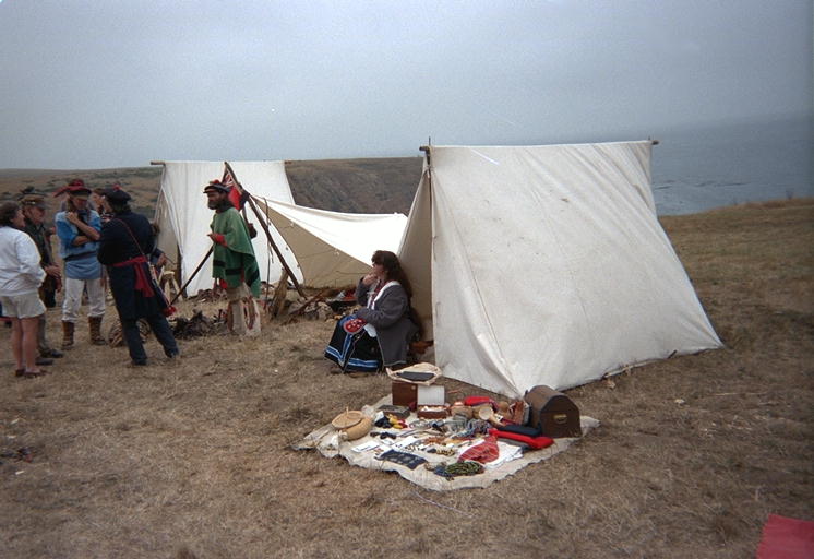 The State Park people and the volunteers had lots of things to look at while I waited for the cannon fire. There were interactive demonstrations where kids of all ages could make a candle or weave a basket. Most of the roped-off rooms in the Fort had someone inside and in costume, talking about the artifacts. There was a troop of men in uniform bivouacked in the field west of the fort. In the middle of the Fort there was a kitchen set up with a sheep turning on a spit, salad and borsch. You had to be one of the park personnel or a volunteer in costume to eat at this kitchen, us tourists had to bring our own food.