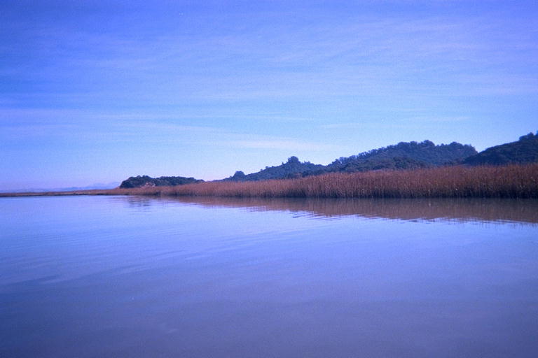 On the next weekend, when I was going to work Sunday evening anyway, I stopped at McInnis Park on the way to work. I got in the creek at their canoe launch around noon, near the peak of a mild high tide. What do you call it when you go "down stream" in a creek, but the water is running up the creek? I paddled straight down to the bay without exploring back up the larger creek that joined the little one from the park. As the creek widened out, I turned south and followed the marshy shore. Most of the places on the Greater San Francisco Bay shores used to have shallow marshy edges like this, but they have been "developed". This usually means putting in artaficial shorelines made of blocks of old concrete, and filling in the marsh with soil. So it is wonderful to find a stretch of shoreline that shows what the bay must have loked like when we first found it. Even though I was practically in the middle of the city of San Rafael, I could pretend I had traveled back in time to an un-modified Bay. McInnis Park, and another park farther south, connected together on the shore here and made at least a 15 kilometer stretch that has been spared the development of the rest of the bay. I angled my camera to point at places which did not have buildings or power poles in them, to bring back pictures from my time travel expedition.