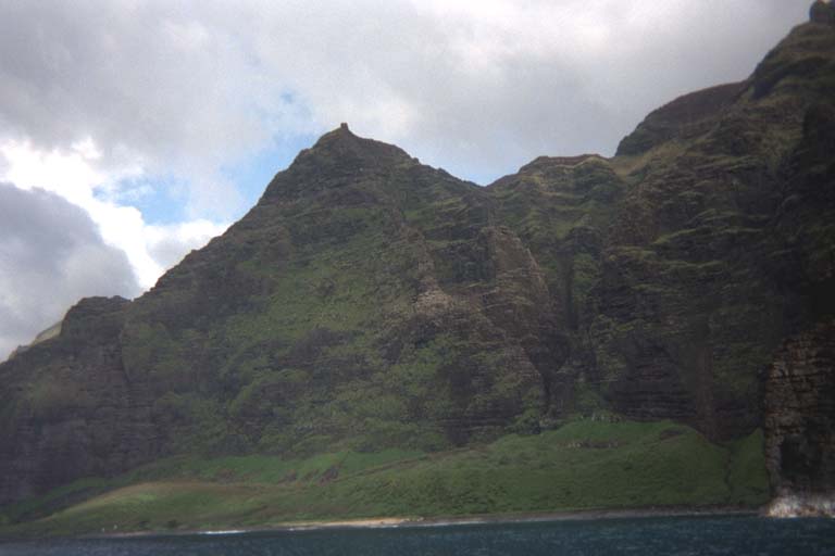About the time we saw the jet skis, we came to a place where the chart showed a knob of rock sticking out between two points, called Honopu Valley. What the chart failed to mention was that there was a beautiful sandy beach on both sides of the knob, with an arch in the knob that looked like it created a walking trail between the beaches. Each beach had a large sand dune in the back covered with greenery and even trees making me think these beaches had been here for a while. To our surprise, there were three people surfing off of one of these beaches. We wondered if they paddled their surf boards all the way down here until we saw a zodiac anchored off the southern point. Apparently some surfers will go to great lengths to find a good place to surf when the swells at sea are mild like they had been for the last week.